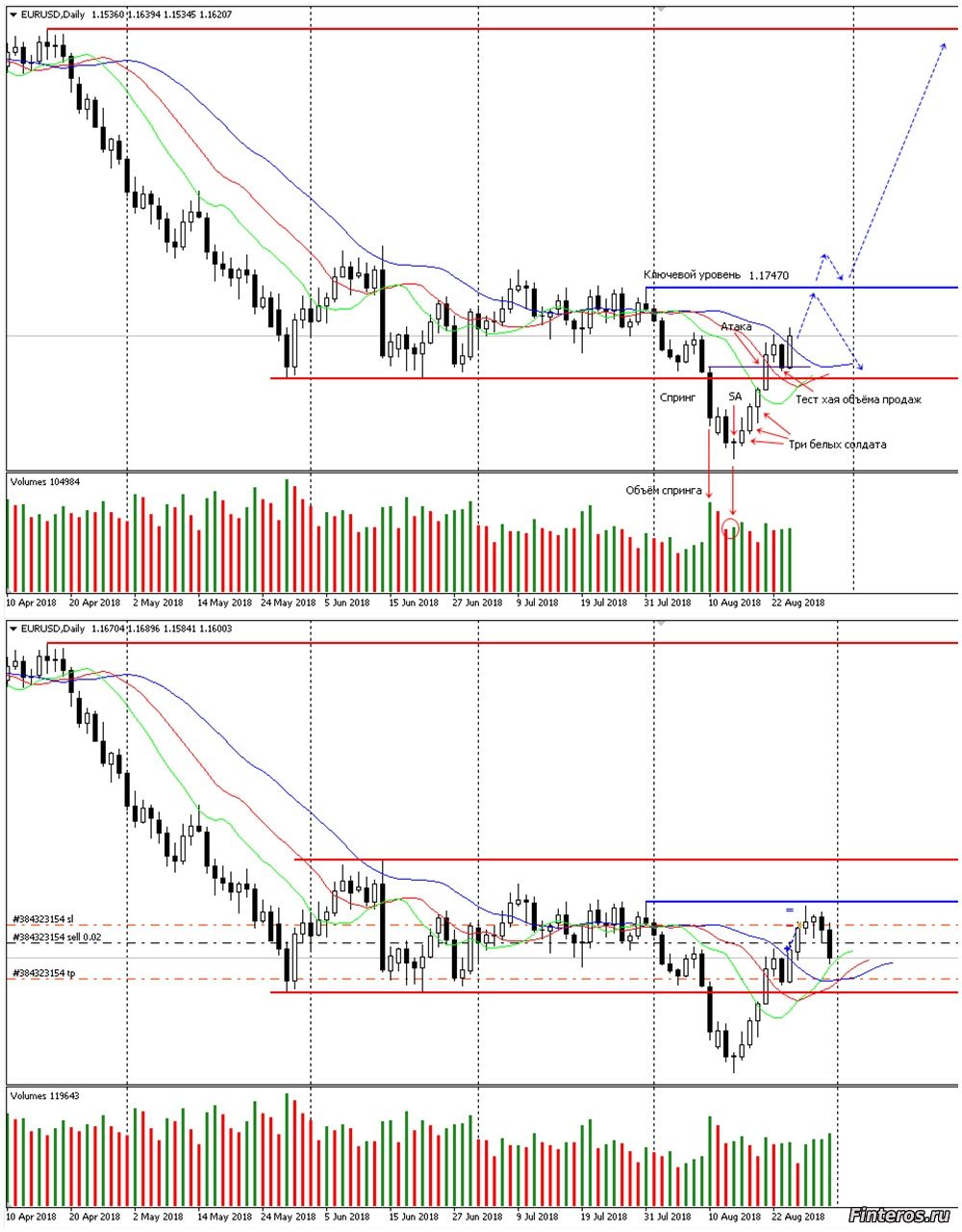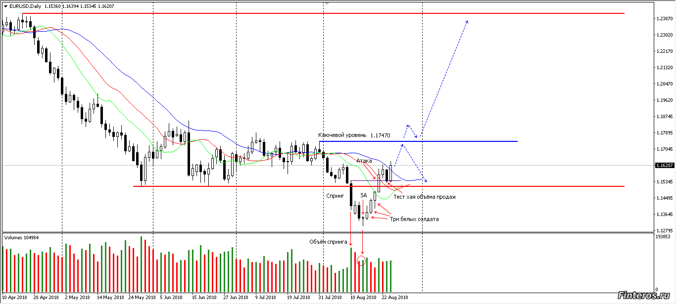 Евро на Д1 образовало модель Спринг ( ложный пробой нижнего уровня). Свечная модель Три белых солдата получила подтверждение в виде свечи Атака. Прошёл тест хая объёма продаж и отскок от этого уровня. Ожидаю движение цены к уровню 1.17470, а дальше или отбой от него или пробитие и продолжение движения вверх. Ищу сигнал для покупок. |