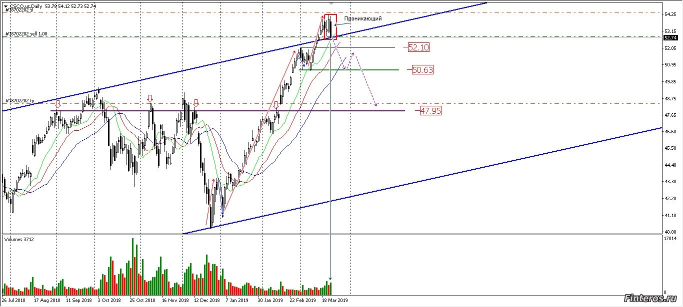 Cisco - американская компания в области сетевых технологий показывает уверенный рост своих акций с января 2019 года. Но сейчас появились признаки разворота этого ап-тренда - неуверенное пробитие верхней границы восходящего канала "мелкими" свечами и появление разворотной модели "Проникающая линия" на возросшем объёме. Рассматриваю дальнейшее снижение цены как минимум до начала последнего импульса вверх 50.63 с последующим снижением до зеркального уровня 47.95. |