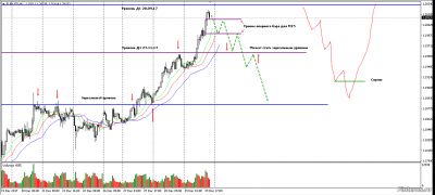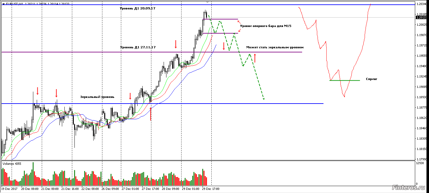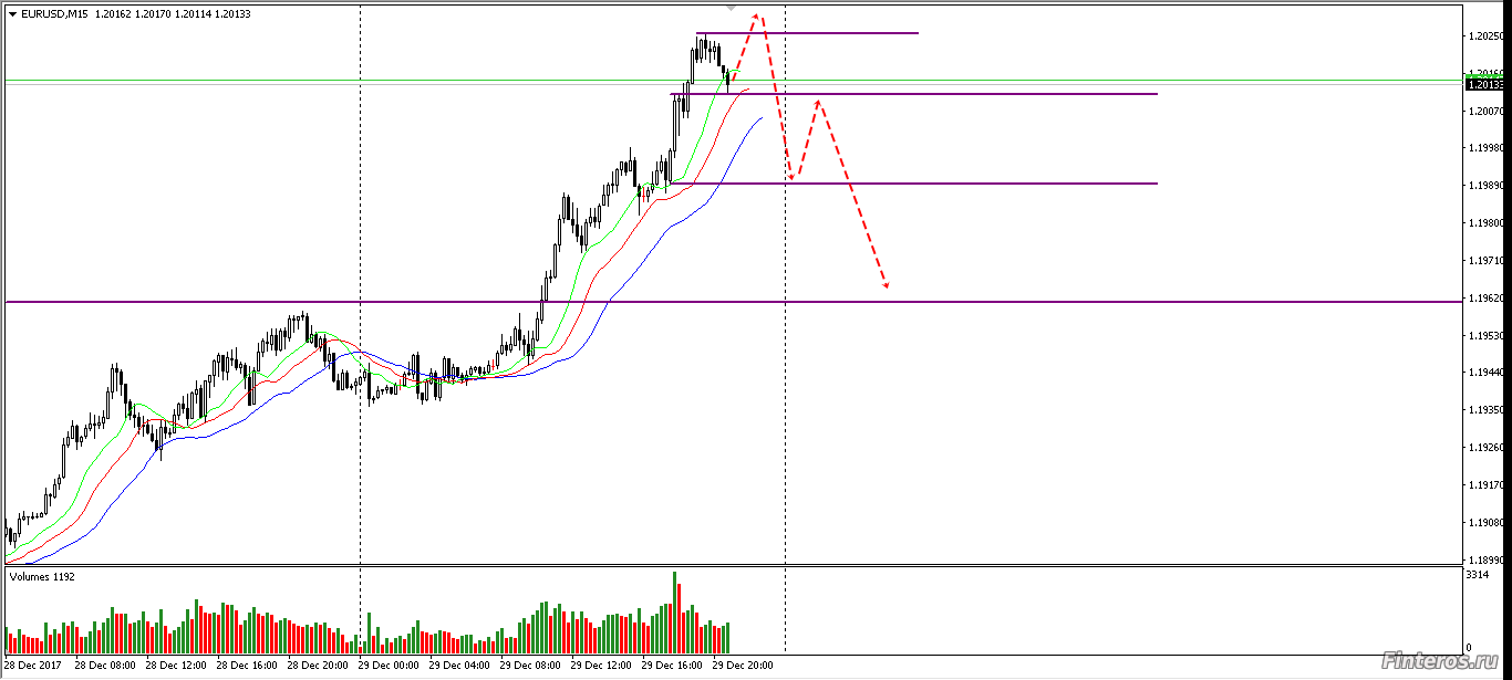 Цена дошла до уровня продаж Д1. Появился Доджи неопределённости, объёма нет, нерешительность перед уровнем сопротивления. До уровня ещё с десяток пунктов. Предполагаю ещё один рывок вверх и коррекционный откат . В краткосроке на М15 можно торговать. Для покупки буду ждать отката вниз, вход на спринге или разворотных свечах