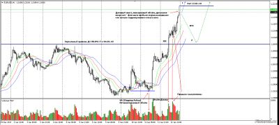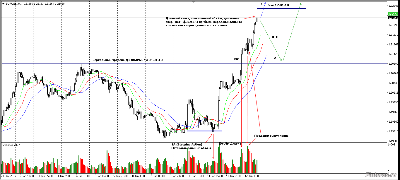 Обозначилось явное движение вверх. Уровни Д1 пробиты на росте объёма, классический сигнал JOC (Jump over Creek), надо дождаться коррекционного отката вниз BTC (Back to Creek), заход цены под аллигатор и образование разворотной модели.