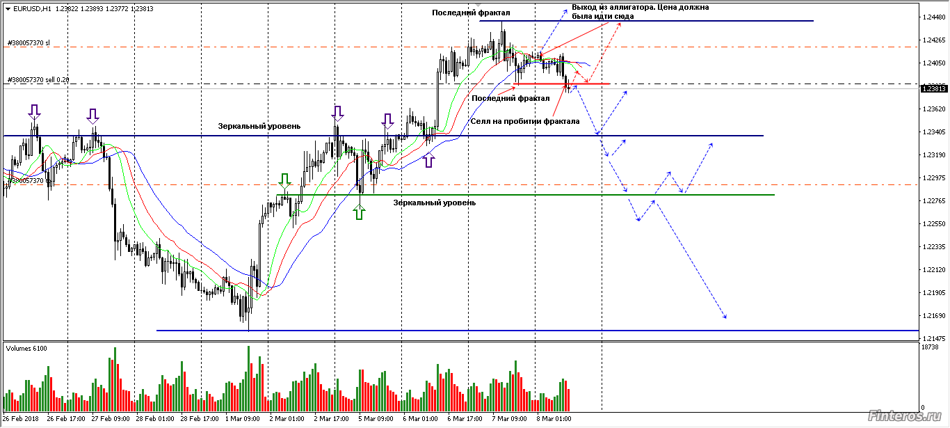Цена не пошла к уровню последнего фрактала и провалилась под аллигатор. Фрактал под аллигатором стал пробиваться, вошёл в селл. Стрелками обозначены возможные направления движения, если фрактал пробьётся в обратную сторону (ложный пробой) - выход. Внизу зеркальный уровень - контроль за поведением цены. |