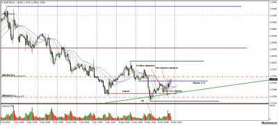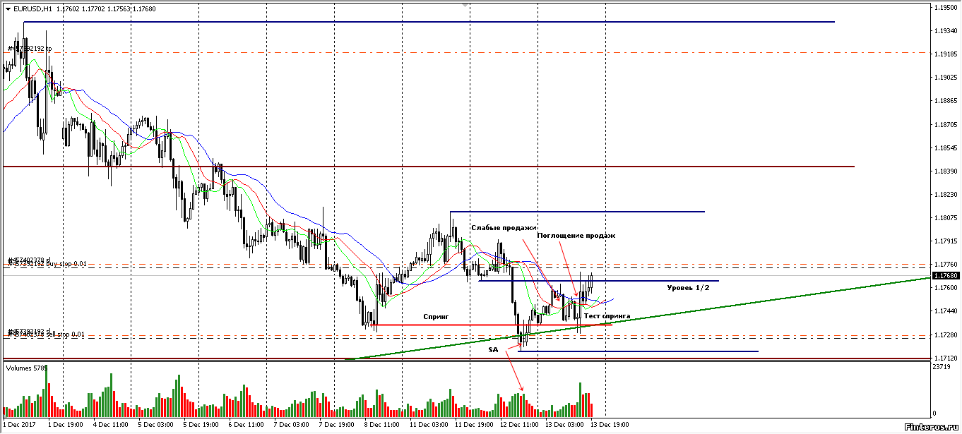 Вчерашний ордер закрылся с профитом, спринг действительно нарисовался, прошёл его тест и сейчас цена вплотную подошла к уровню 1/2. Продажи слабые, подход к уровню на росте объёма. Установил бай-стоп 1.17734. Смущает необъёмное пробитие спринга. Установил селл-стоп по цене 1.17258 на случай продолжения падения.