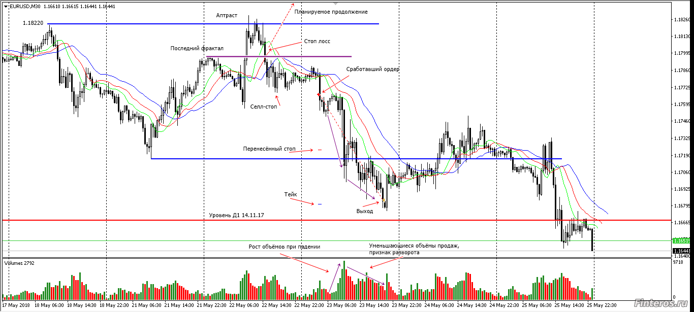 22.05 евро не смогло пробить верхнюю границу канала 1.18220, образовав модель Аптраст. Далее цена упала под Аллигатор и весь вечер находилась под ним. Поставил селл стоп под фракталом падения и оставил ордер на ночь. Ночью ордер сработал и цена на росте объёма приблизилась к нижней границе канала. После пробития канала уже на уменьшающихся объёмах евро продолжило падение. До тейка оставалось несколько пунктов, не стал ждать его срабатывание, сделку закрыл.