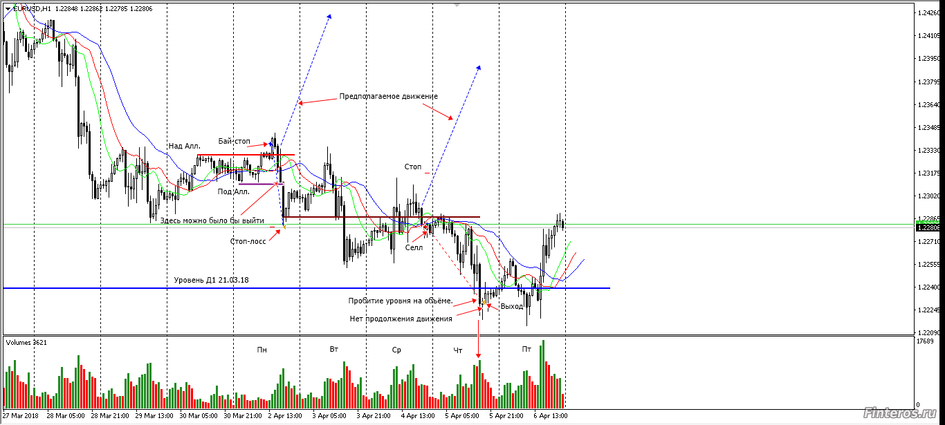 На прошедшей неделе две сделки по евро. На первой сделке бай стоп над последнем фракталом, предполагал, что цена пойдёт вверх. Но сделку контролировать не мог, цена упала под аллигатор, была возможность выйти с меньшим убытком. На второй сделке цена ушла выше аллигатора, но вверх не пошла, на объёме провалилась под него, селл по рыночной цене. На следующий день уровень Д1 пробит на объёме, предполагал, что цена пойдёт ниже, но она нарисовала пин бар с повышенным объёмом. Сделку закрыл.