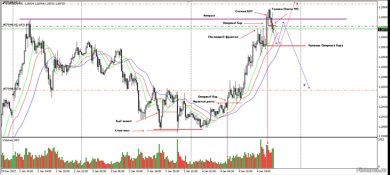Вчерашняя сделка закрылась по стоп-лосу, уже ушёл спать, не видел. Днём за компьютером меня не было, второй заход можно было сделать после пробития фрактала роста на объёме. Сейчас был ложный пробой уровня 02.01.18, появился сигнал SOT, на М5 нарисовалась голова-плечи. Последний фрактал пробит на объёме, опорный бар образовал уровень, если цена его пробьёт - пойдёт ниже. Наблюдаю. |