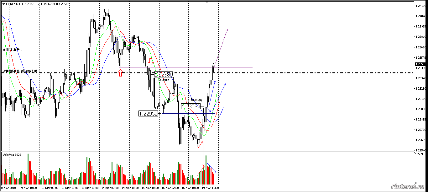 Открытая 15.03.18 сделка селл закрыта по перенесённому стопу. Цена на росте объёма зашла в аллигатор, отскок от синей линии слабый. Стоп поставил над хвостом свечи. В бай не мог зайти, так как ждал отката до пробитого уровня, но его не было. Сейчас цена дошла до зеркального уровня 23470 на падающих объёмах. Ожидаю ложное пробитие уровня. Селл стоп под свечой пробития. Если цена пойдёт дальше - ордер отменю, искать новый вход в сделку |