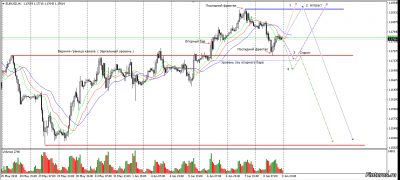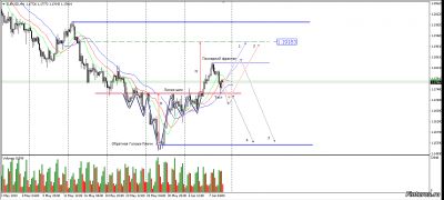 Евро на Н4 закончило формирование обратной голова-плечи и прошёл тест линии шеи. На Н1 линией шеи образован зеркальный уровень, выше которого в данный момент находится цена. Если цена выйдет из аллигатора вниз она пойдёт к последнему фракталу. Далее два варианта - или произойдёт его мощное пробитие и цена пойдёт к нижней границе канала или будет его ложный пробой и образуется модель спринг. Аналогично выход из аллигатора вверх - или продолжение или ложный пробой (аптраст). Возможны ещё пара вариантов, но подробное их рассмотрение по ходу движение цены.