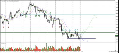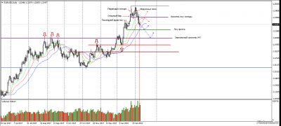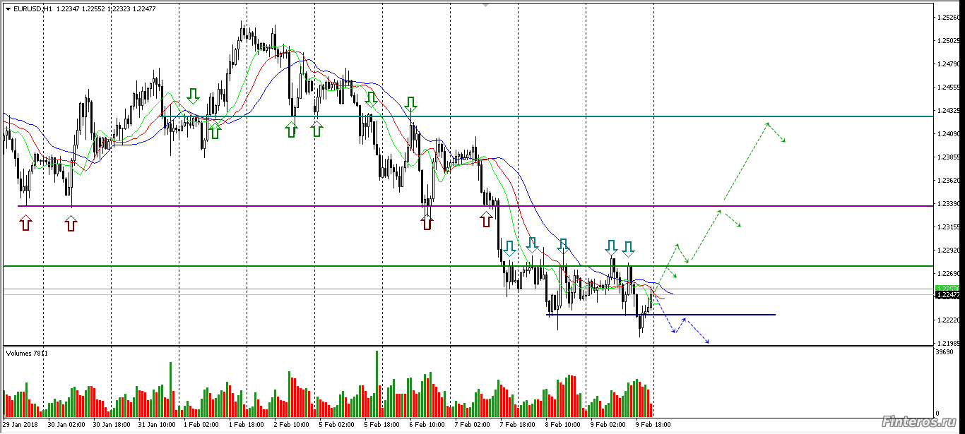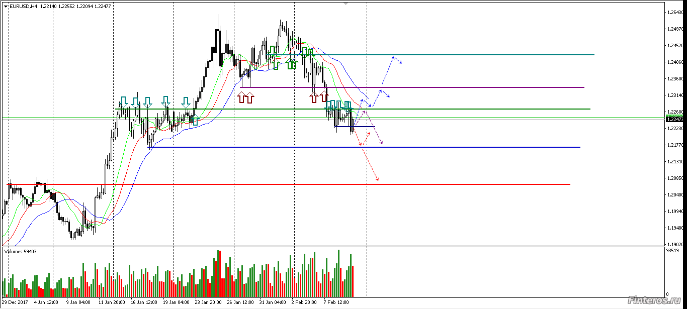 На Д1 цена зашла в Аллигатор и встала, а это признак флэта. Две последние свечи - Волчок и Доджи с объёмом больше свечи падения - знак остановки движения. Ещё не было теста уровня лоу Падающей звезды Д1 ( уровень сопротивления), цена ещё не дошла до уровня лоу прошлого флэта 18.01.18 ( уровень поддержки ). Думаю, что цена стремится к тестированию зеркального уровня W1.