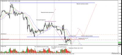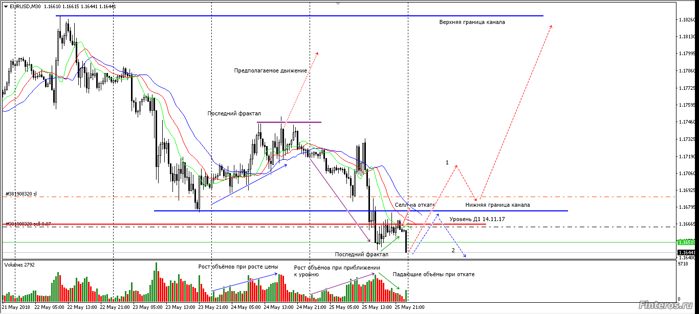 Цена пробила нижнюю границу канала М30 и уровень Д1 от 14.11.17 на растущих объёмах. Уровень Д1 протестирован и на отскоке от него вошёл в селл. Сделка осталась висеть на выходные. Возможен тест нижней границы канала и продолжение движения вниз. При заходе цены в канал получится спринг, ложный пробой нижнего уровня, и движение вверх к верхней границе канала.