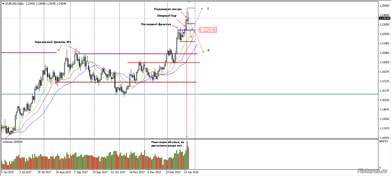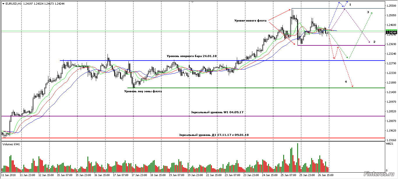 Евро образовало уровни зоны флэта. Границы могут быть расширены до пятницы 02.02.18 . В пятницу выход перлоуз. Вот тогда, думаю, и начнётся вся движуха. На Д1 появилась Падающая звезда с большим объёмом, но тренд изменится если цена закрытия дня будет ниже 1.22930. Во флэте торгуется ложный пробой уровня, поэтому буду искать спринг, аптраст или зеркальные уровни на мелких периодах.